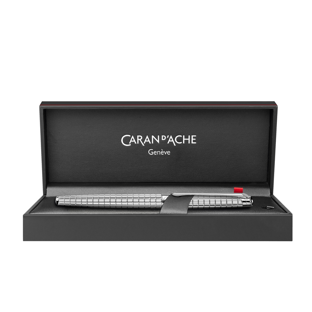 - Kvalitet: De rhodium- och silverpläterade beslagen, den diskreta svartlackerade hexagonen på huven och graveringen "Caran d'Ache logo" och "Swiss Made" på ringen bekräftar dess varaktiga kvalitet.