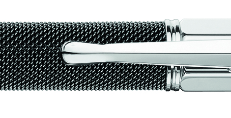 Pennkroppen i mässing, täckt av det svarta ringbrynjeskiktet, kompletteras av en precis tryckmekanism för optimal användarkomfort och ett fjädrande klips.