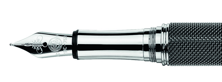 Pennan har en sexkantig kropp i mässing och är utrustad med en spets i 18 karats guld som är rodiumpläterad.