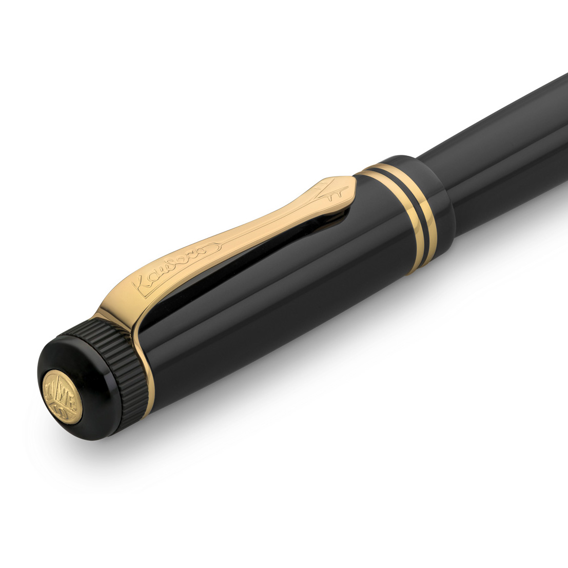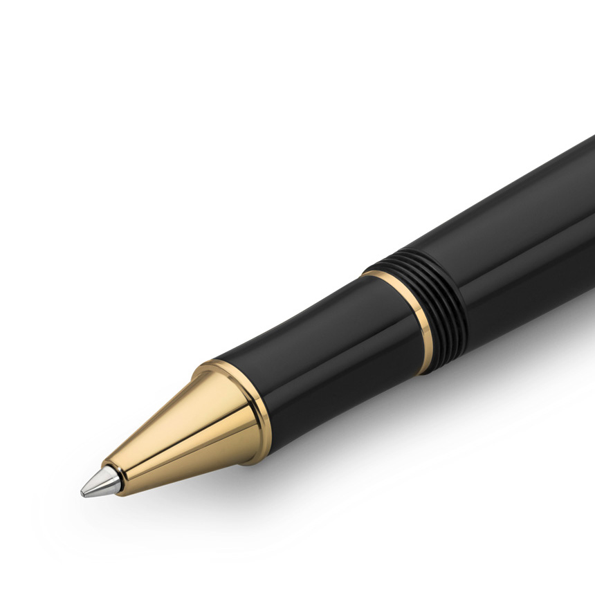 Unna dig en lyxig rollerball i nostalgisk design, tillverkad i djupsvart akryl och utsmyckad med eleganta guldfärgade metaldetaljer..