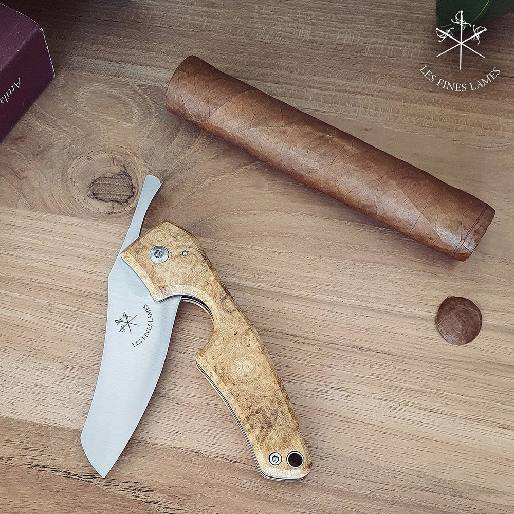 Tillverkade i Frankrike med blad i 14C28N stål. Handtaget är tillverkat av Acaciaträ.