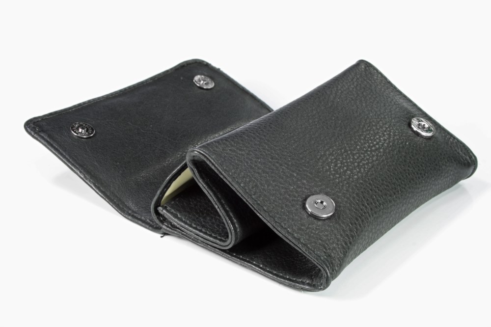 Liten tobakspung, utav box typ tillverkad i mjukt koskinn. Insidan är klädd med luktfritt naturgummi.